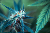 Flowering cannabis bud with lush green leaves and ripe orange trichomes close up. Medical cannabis growing concept