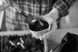 Farmer transplants tomato and pepper seedlings into peat cups. Preparing plants for growing in open ground. Home gardening concept