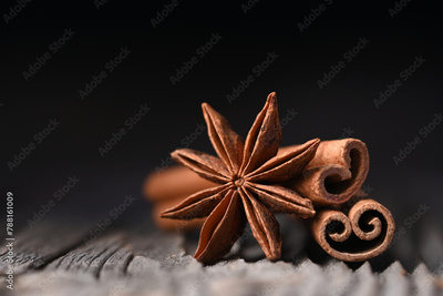 Anise star and cinnamon sticks on wooden board close up. Studio macro shot. Food photography