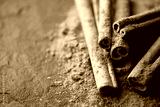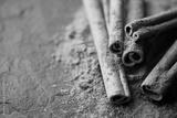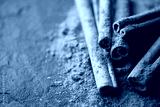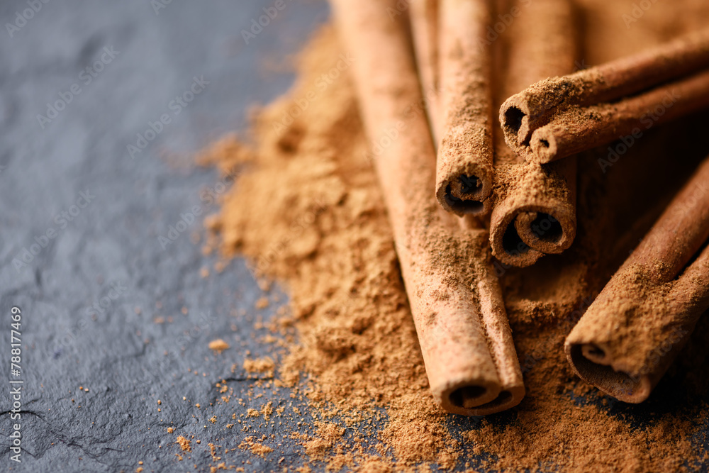 Cinnamon sticks and cinnamon powder on black slate plate close up. Studio macro shot. Food photography
