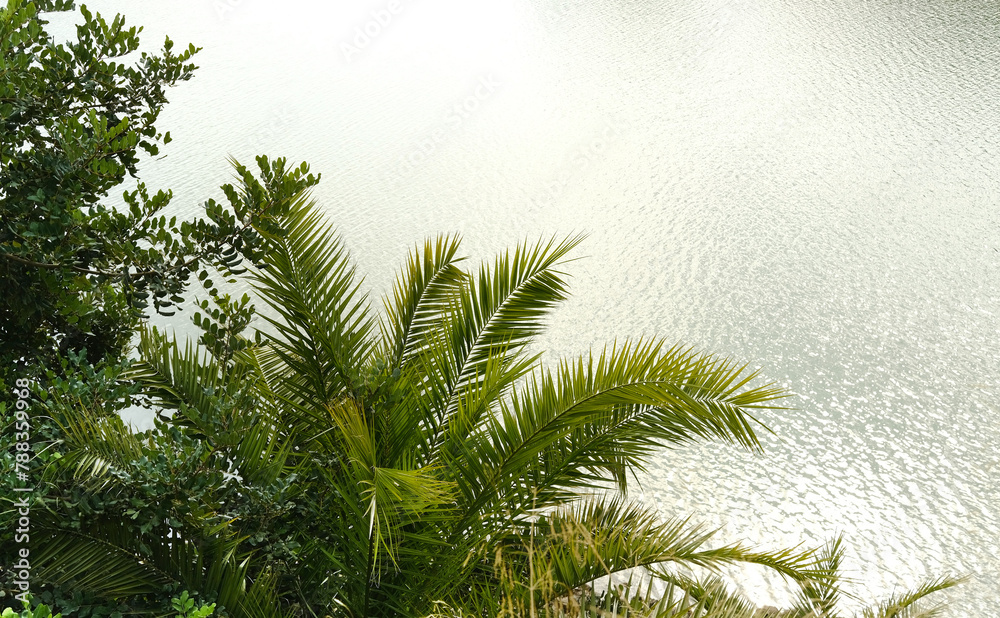 tropical date palm gracefully sways against water, natural beauty tropics, infinity tropical background, exotic banner for travel agencies, hotels, airlines