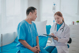 Young Asian female doctor talking with elderly man Provide care and assistance to patients in hospital beds Elderly health care and medicine
