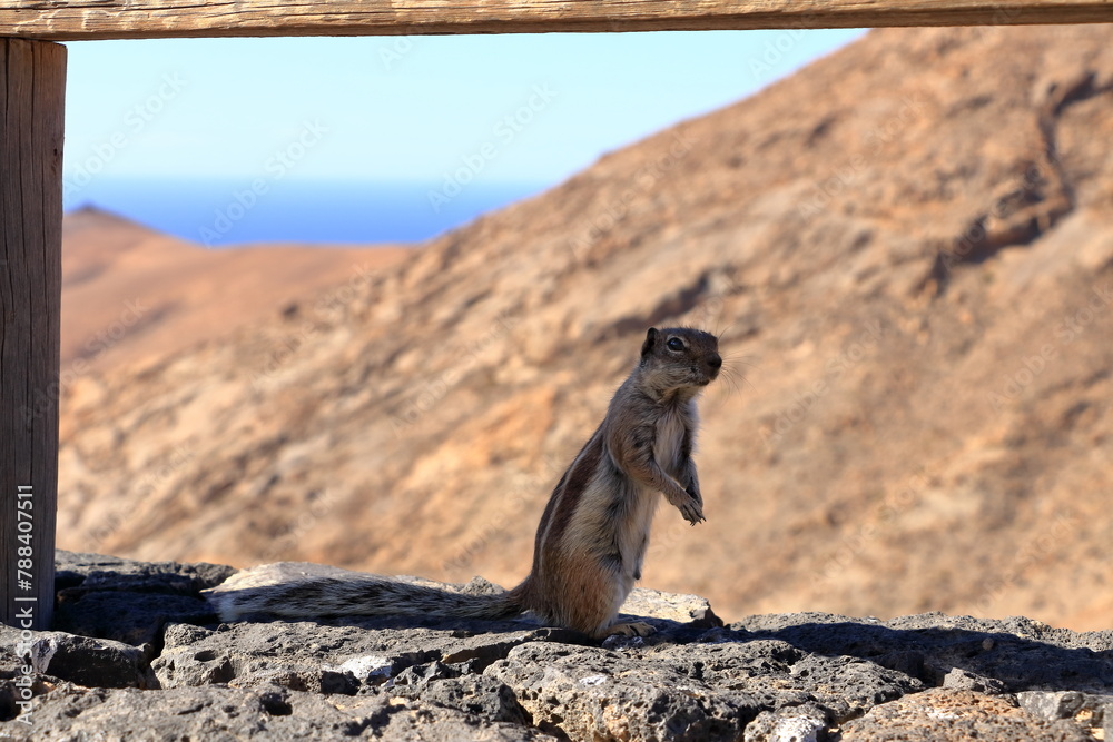 Barbary ground squirrel (Atlantoxerus getulus) sitting on a rock, Fuerteventura, Canary Islands, Spain