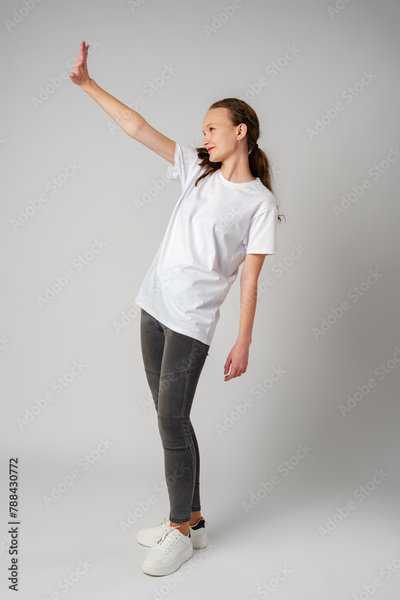 Beautiful young girl posing in white T-shirt and jeans on gray background