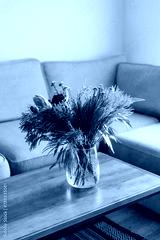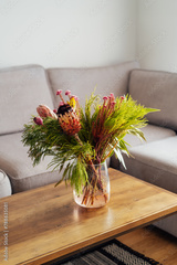 Vase with exotic protea flowers bouquet on coffee table with blurred background of modern cozy light living room with gray couch sofa. Open space home interior design. Elegant home decor. Copy space.