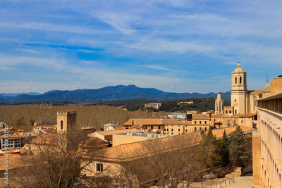 Panoramic view of Girona viewed from the medieval city walls, Catalonia, Spain