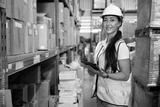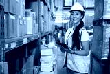 portrait worker working on tablet and looking at cardboard box on shelf in warehouse storage