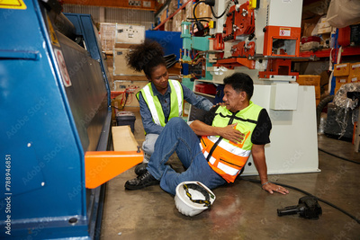 senior worker or engineer have heart attack and fell down, coworker helping him in the factory