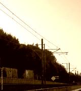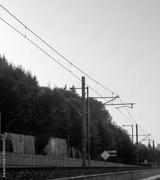 Light rail and power lines at twilight