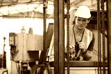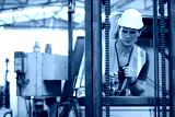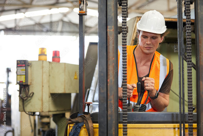 male factory worker control and holding steering wheel on forklift truck