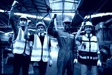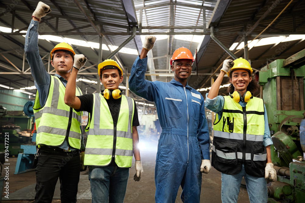 workers or engineers raise hands for success work and project in the factory