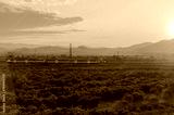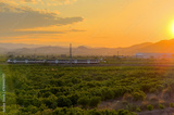 Train on railway in motion on sunset. Traveling on High-speed train on railway. Train with passenger cars rides. Passenger locomotive with wagons in moving on railroad. Spanish National Rail.