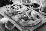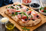 Roman Pinsa with mortadella, parmesan cheese, black olives and arugula on wooden table