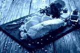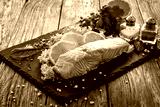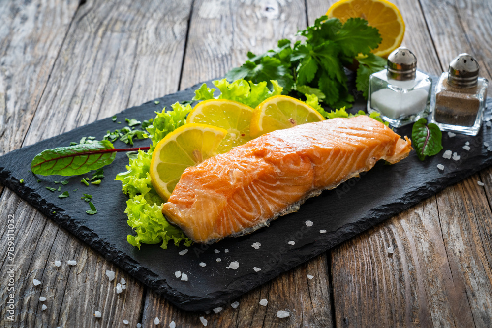 Smoked salmon with lemon and greens on black stony plate on wooden background