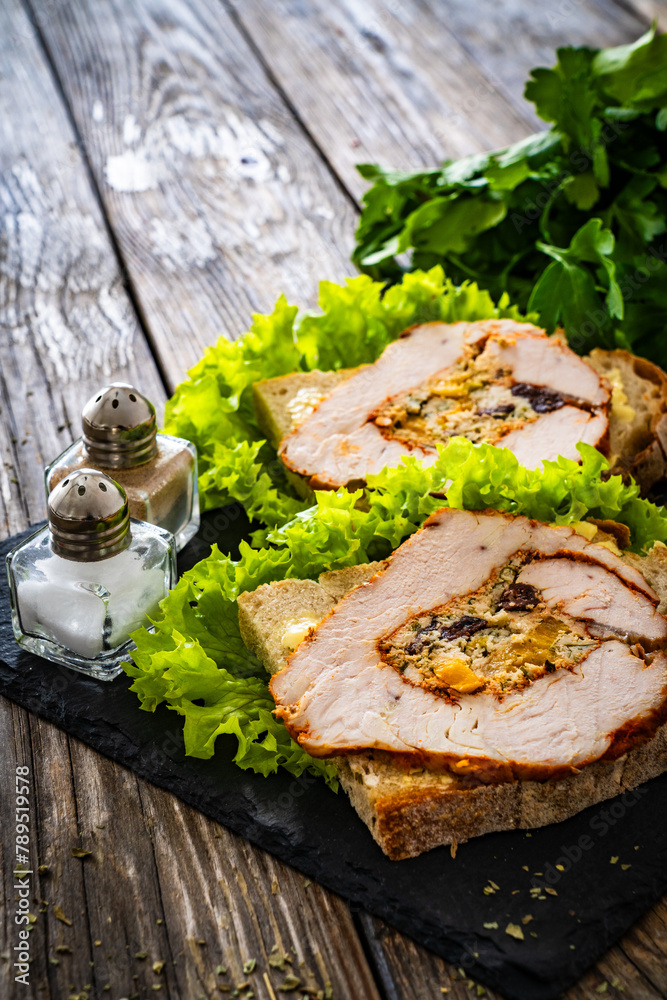 Sandwich with roast turkey breast and greens on wooden table