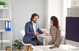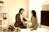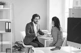 Professional long haired Caucasian man manager talks with woman colleague or subordinate gives recommendations on how to increase productivity sits at office desk by window. Boss, business chief