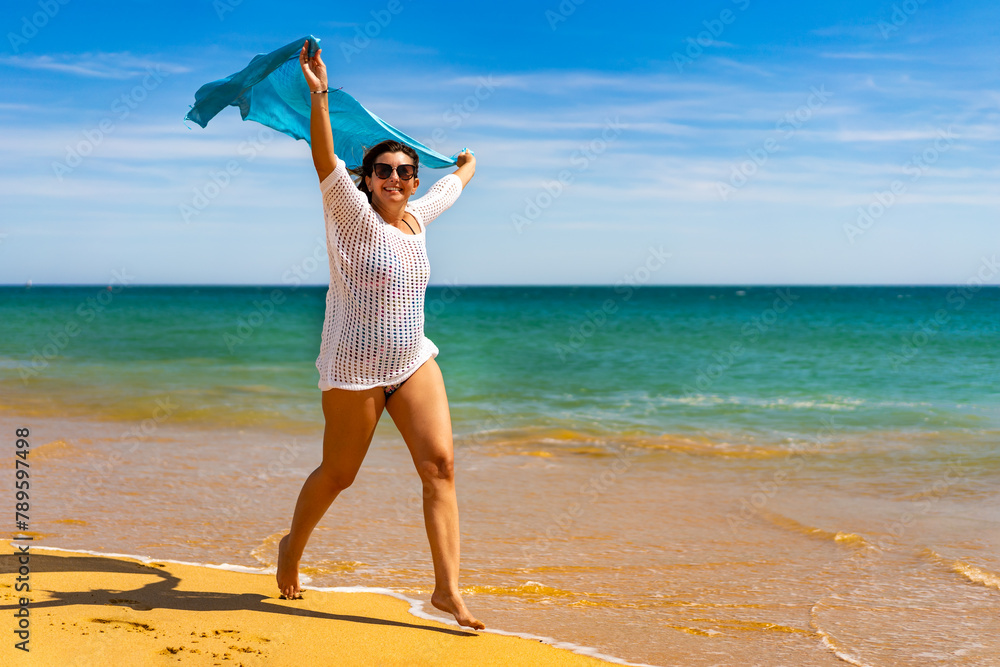 Beautiful woman walking on sunny beach holding shawl