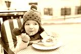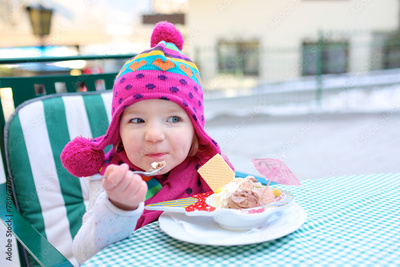 Little girl eating ice cream in street cafe