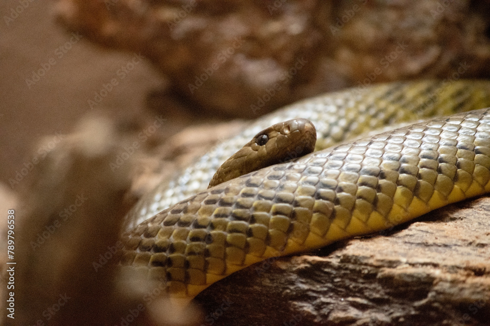 Inland taipan has a rectangular-shaped head distinct from the slender neck.