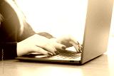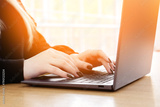 Young white caucasian woman working on computer on wooden table in home office. close up female businesswoman hands typing text on keyboard, surfing internet on modern laptop. mock up, top front view