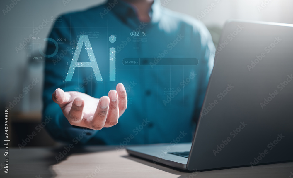 ai, artificial, future, intelligence, strategy, information, education, network, innovation, program. A man is holding the word AI. Concept of artificial intelligence and its importance in technology.