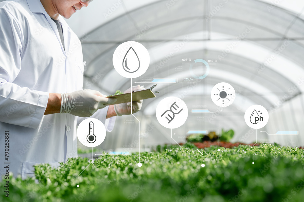 research, science, innovation, person, quality, health, nutrition, data, life, internet. A researcher is looking at clipboard with diagram of a plant. The diagram includes various symbols and numbers.