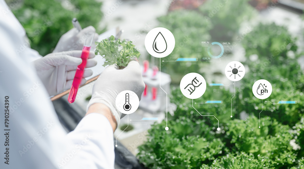 research, researching, network, innovation, health, sustainable, data, internet, greenhouse, environmental. A researcher is holding a plant and a red liquid, surrounded by a lot of scientific symbols.