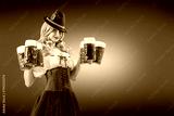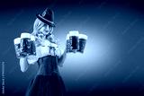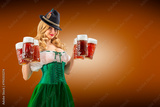 Oktoberfest girl waitress. Woman in dirndl, tyrolean hat serving big beer mugs on isolated background. Traditional Bavarian, German, Austrian party, autumn festival.