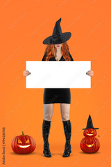 Witch on Halloween holding white mockup template. Female wizard fairy character for All Saints' Day. Fantasy gothic red-haired Vampire girl in black dress. Enchantress dressed in carnival costume