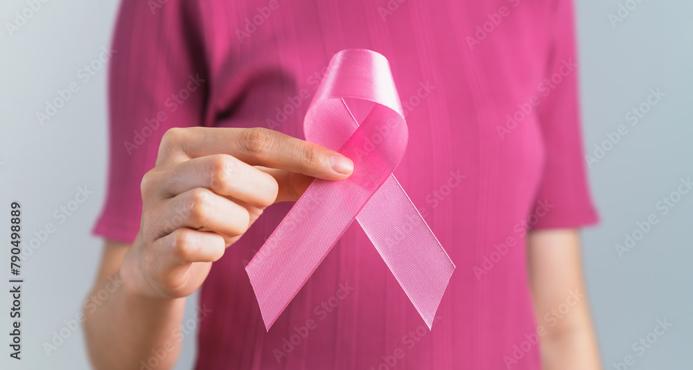 Woman hand holding pink ribbon for breast cancer patients and survivors, World cancer day concept.