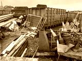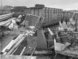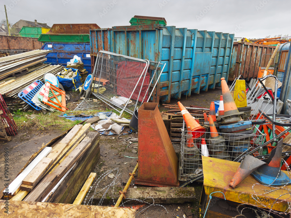 Junk yard and steel container with scrap metal, wood and traffic cones