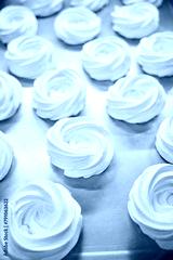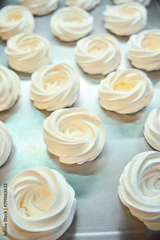 Close-up view many white meringue nests lying on tray