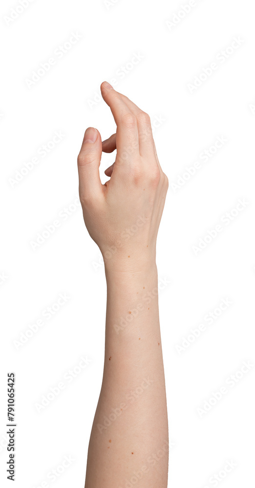 Caucasian woman s hand showing gesture. Empty palm, blank sign, symbol of communication. Isolated, transparent png