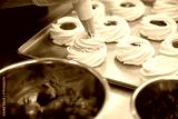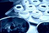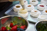 Close-up view baker decorating merengue nest with sweet whipped cream