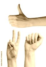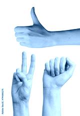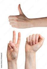 Female hand gestures collection. Caucasian woman showing victory sign, thumbs up, fist, two fingers.
