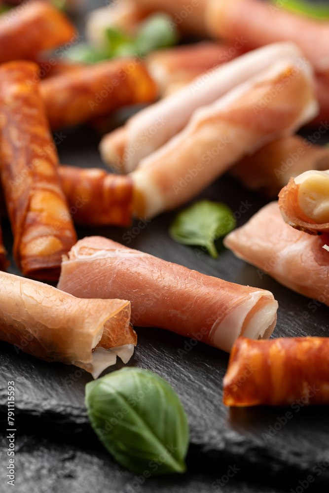 Party food board selection. Serrano ham, prosciutto and chorizo rolls filled with gouda and Iberico cheese.