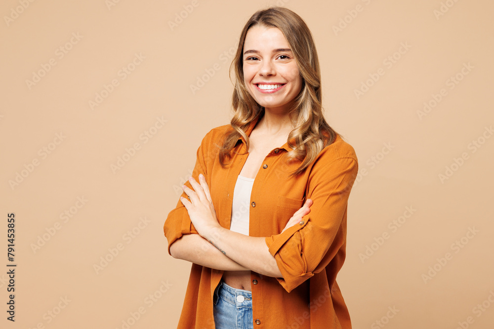 Side view young smiling Caucasian woman she wear orange shirt casual clothes hold hands crossed folded look camera isolated on plain pastel light beige background studio portrait. Lifestyle concept.