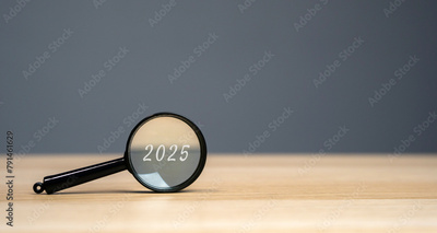 Magnifying glass with the inscription 2025. Setting goals and objectives for the new year. Planning, business management and strategy concept. Trends and ideas. Vision.