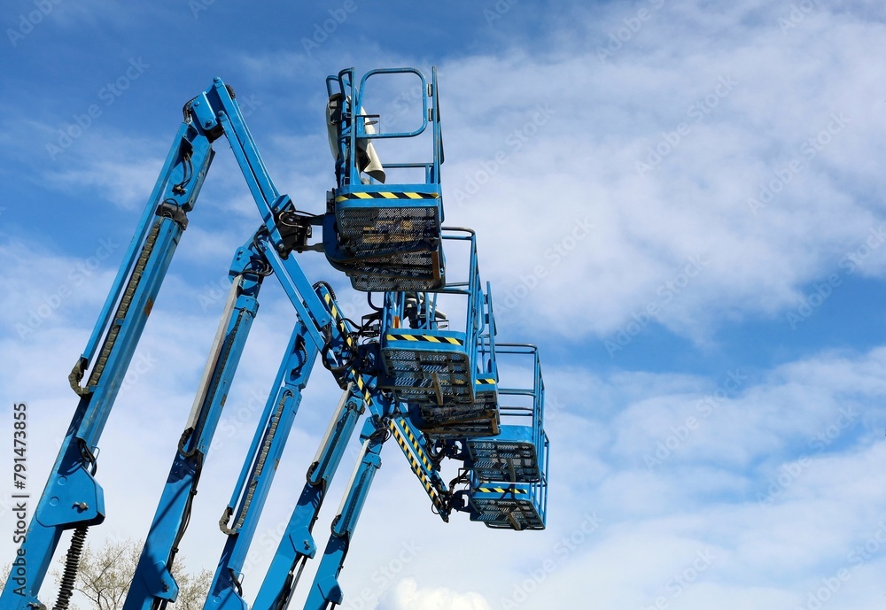 Five blue aerial work platforms of cherry pickers in a row against blue sky with clouds
