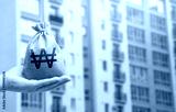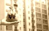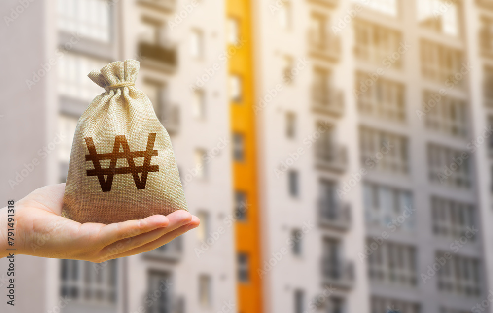 South korean won bag against the background of modern high-rise buildings. Investing in the purchase of real estate. Affordable housing and mortgage rates. Renting apartments and houses. Blurred