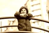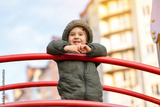 Happy smiling three year old toddler boy on the playground looking into the distance. Childhood and lifestyle concept. Portrait photo