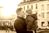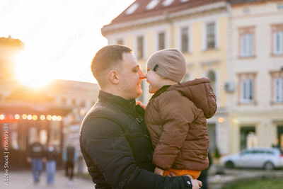 A happy father and three year old son hug in a city street. Warm relationships between parents and children. Spending time together. portrait