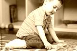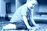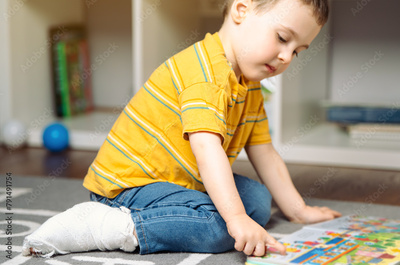 Toddler boy with a bandage or cast on his leg plays with colourful book. Fracture of a foot and finger in children. Human healthcare and medicine concept. focus on the cast