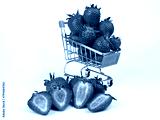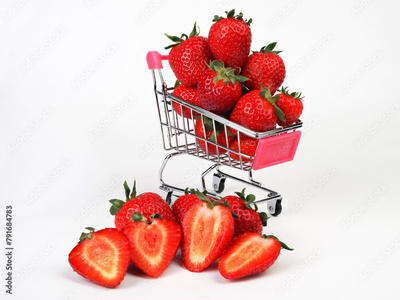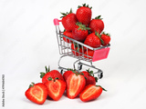 small shopping cart with strawberries on white background