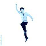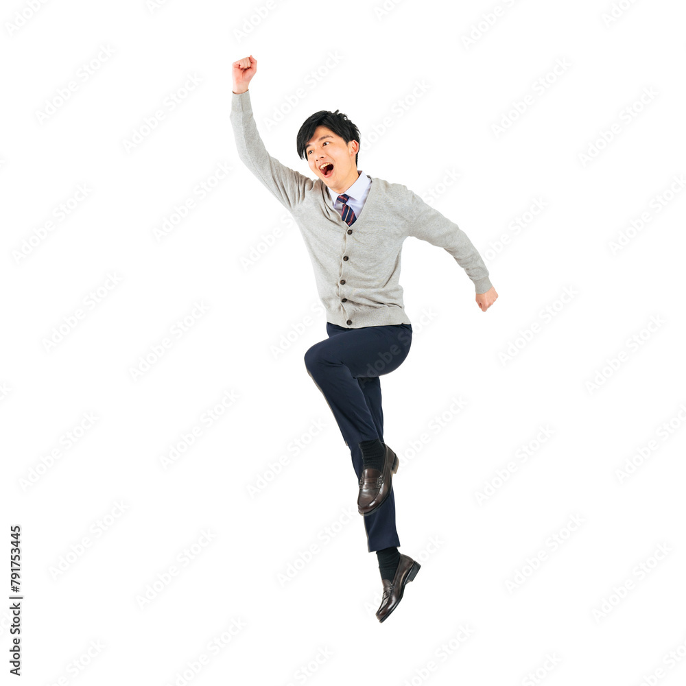 ジャンプする制服を着た男子学生 手作業で精密に切り抜いた背景透過全身写真PNG