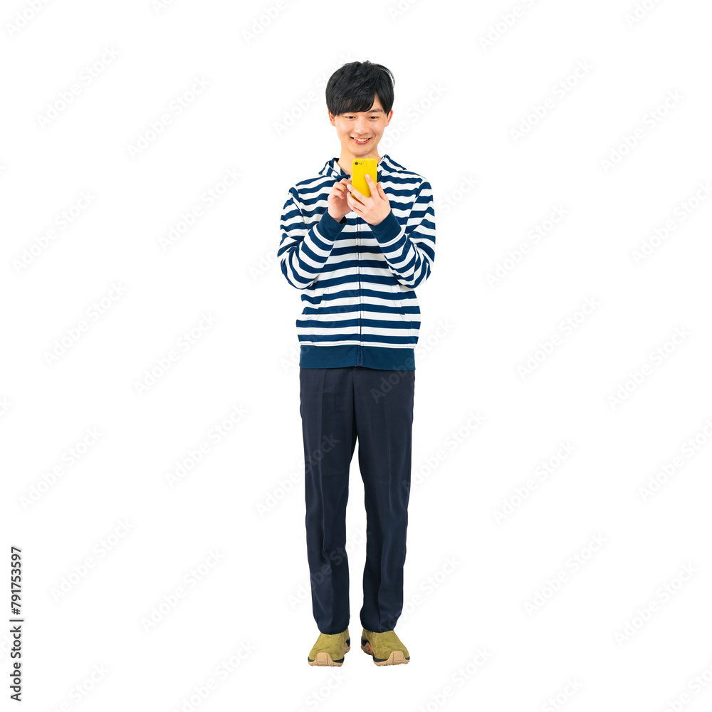 スマホを見るカジュアルな男性 手作業で精密に切り抜いた背景透過全身写真PNG