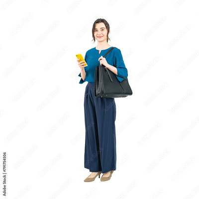 Full body photo of a white woman using smartphone. Full body photo PNG with transparent background precisely cut out with clipping path.