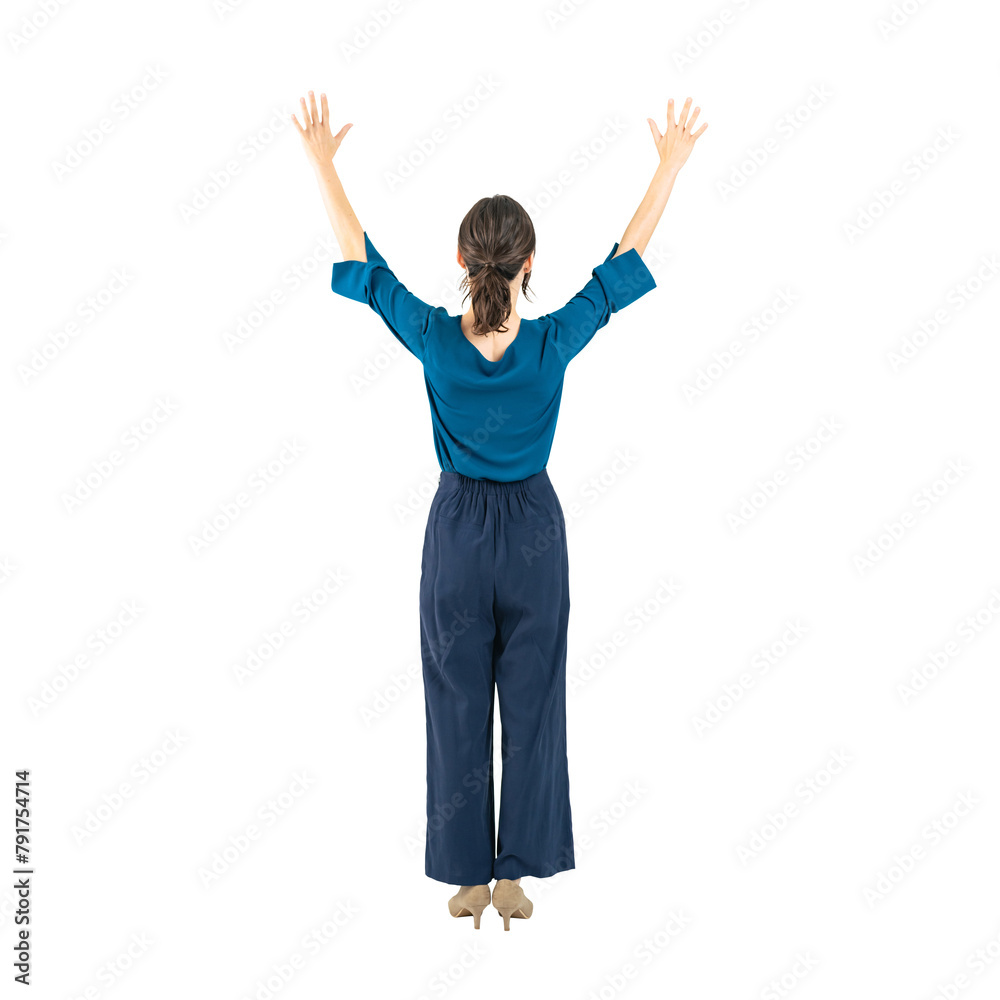 バンザイする白人女性の後ろ姿 手作業で精密に切り抜いた背景透過全身写真PNG