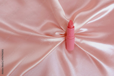 matte lipstick on a delicate pink background, pink silk fabric, close-up, the concept of decorative cosmetics, lip care, female beauty