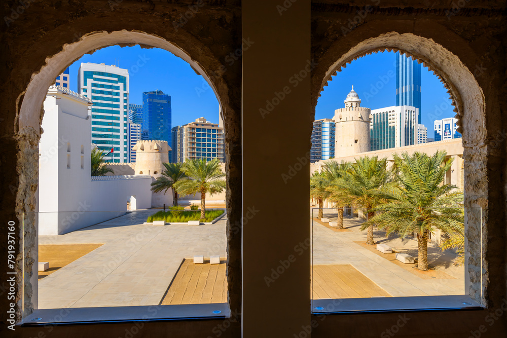 View through arched windows at Qasr Al Hosn fort of the historic Arabic castle and modern skyline of Abu Dhabi, United Arab Emirates.
